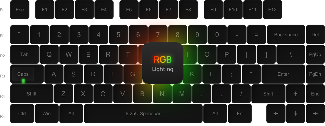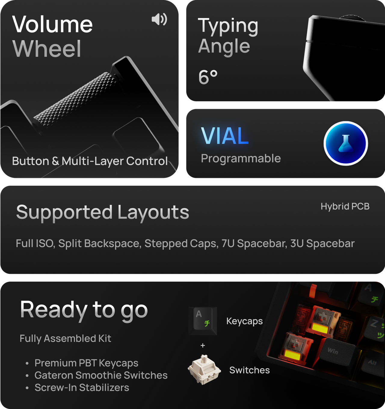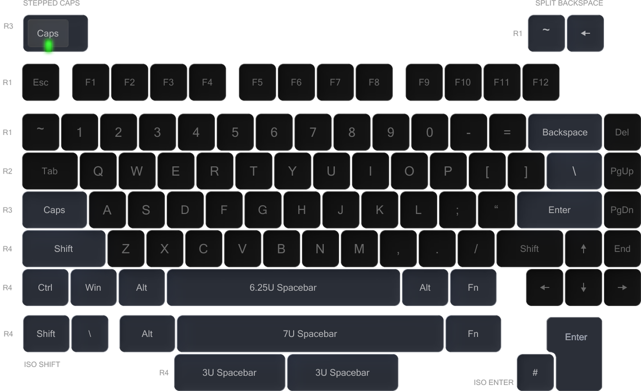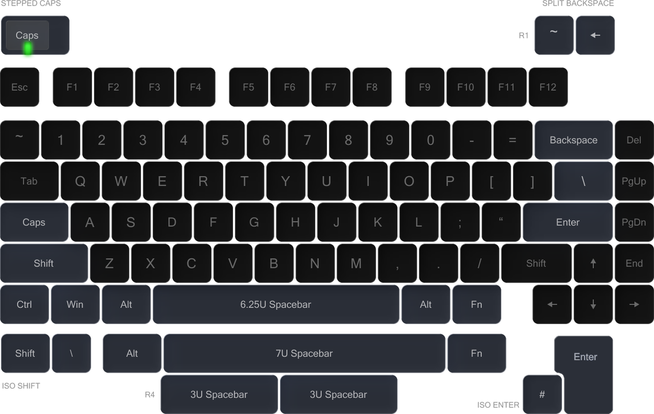 Full ISO Support, Split Backspace, Stepped Caps (with LED Indicator), 7U Spacebar, 3U Spacebar