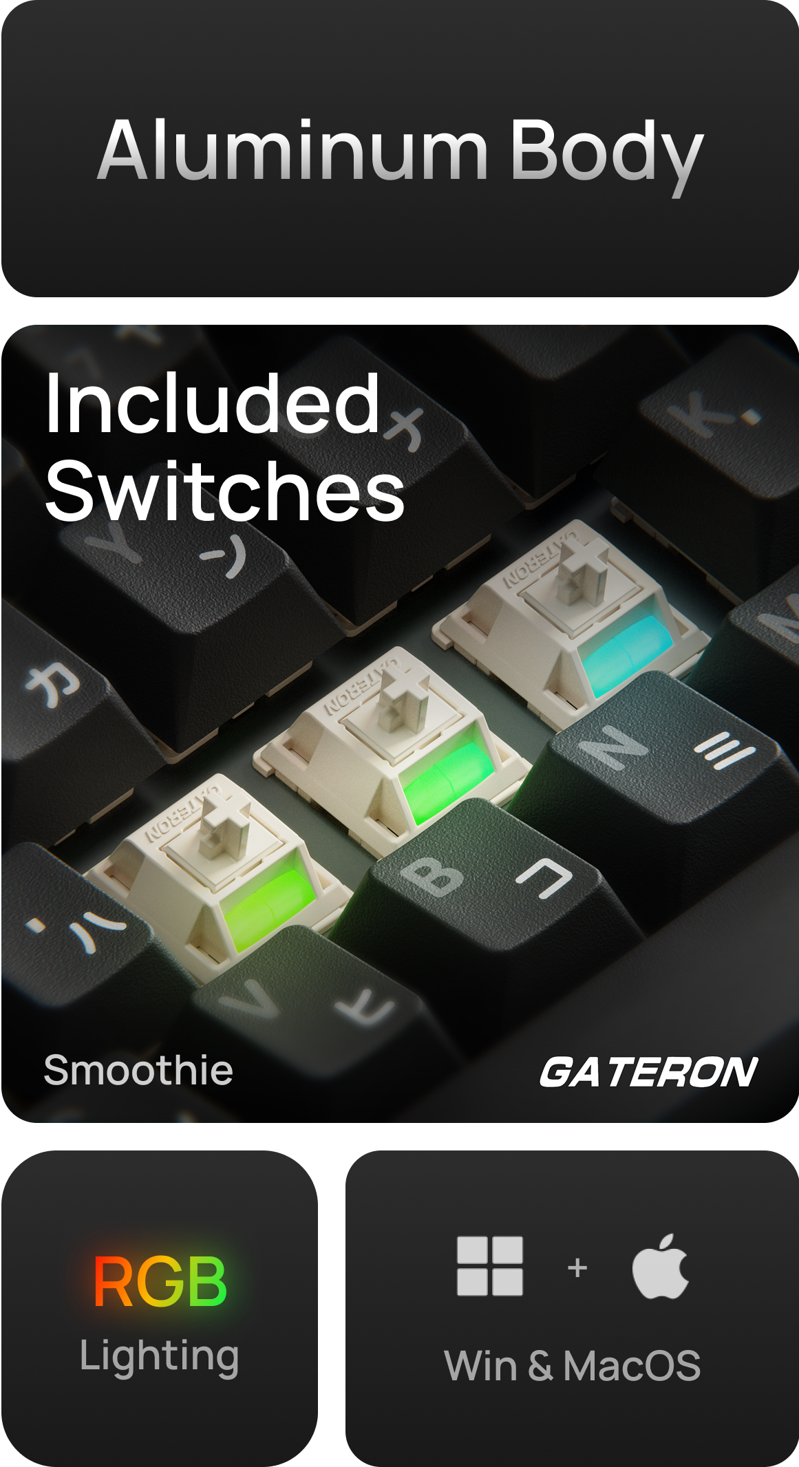 Fully assembled, complete with factory-lubed Gateron Smoothie switches and double-shot PBT keycaps, so it’s ready to go right out of the box!